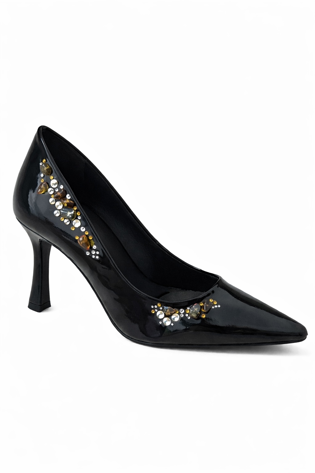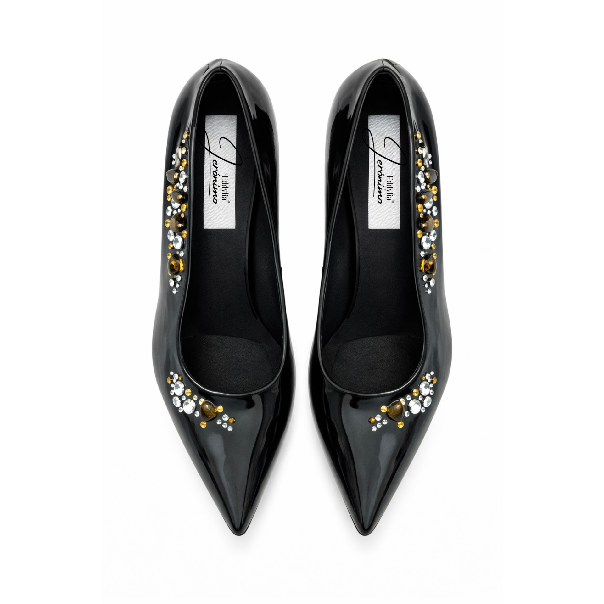 Esta zapatilla de tacón en charol negro ha sido diseñada para mujeres que desean destacar con elegancia absoluta. Su silueta estilizada y su tacón de 9 cm realzan la figura, mientras que la aplicación artesanal de ámbar natural y cristales finos convierte cada par en una pieza única e irrepetible.